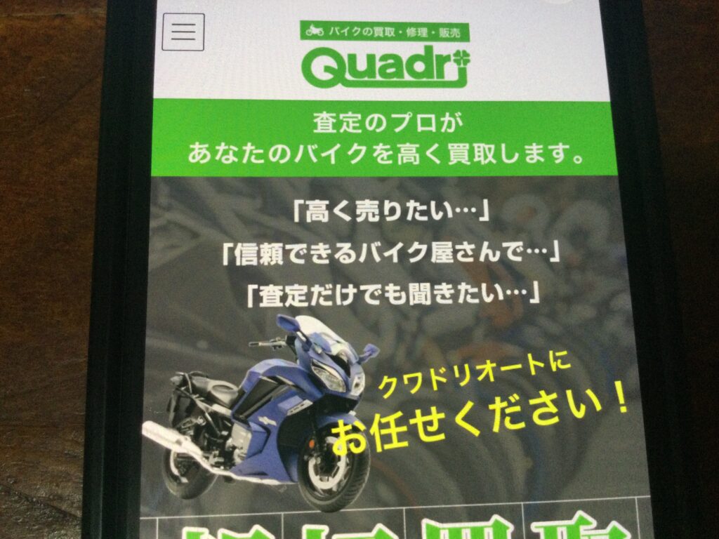 - 事故車や不動車の買取も得意とするクワドリは、全国のバイク愛好者から信頼を受けるバイク買取専門店です。