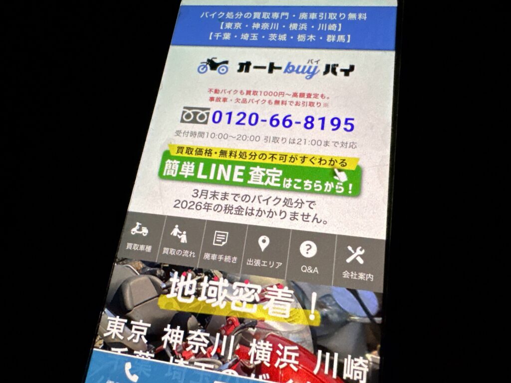 - 東京都東久留米市を拠点に、東京・神奈川・千葉・埼玉・茨城・栃木・群馬を対象とした出張買取サービスを展開。不要なバイクを簡単に処分できます。
