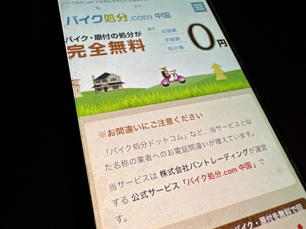 バイク処分.comは岡山を中心に、中国地方でバイクや原付の廃車・回収サービスを無料で提供する専門業者です。