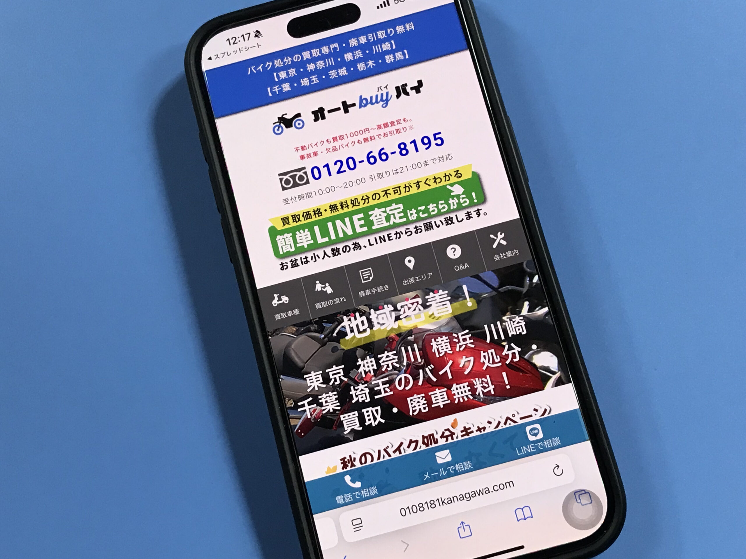 株式会社1plus1が運営する「オートバイバイ」は、東京・神奈川・横浜・川崎・千葉・埼玉・茨城・栃木・群馬エリアにおいてバイクの処分や買取専門店として業務を展開しています。