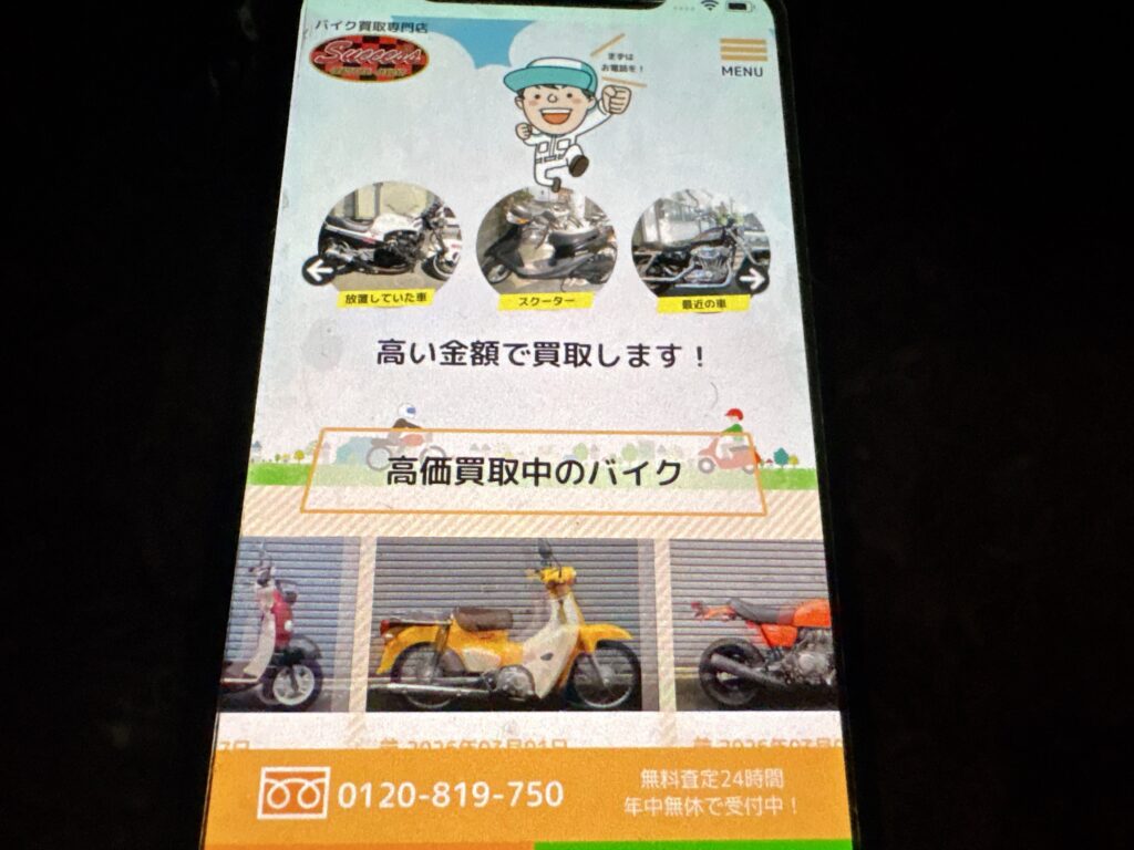 創業20年以上の実績を持ち、不動バイクや事故車などの無料引取りも行っており、通常1000円から5000円での買取を実現しています。