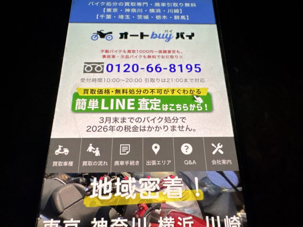 株式会社1plus1が運営する「オートバイバイ」は、東京・神奈川・横浜・川崎・千葉・埼玉・茨城・栃木・群馬を中心に、バイク処分と買取の専門店を展開しています。