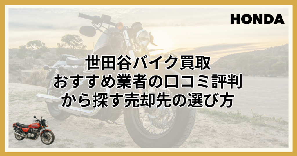 世田谷でバイクを売りたいけれど、どの買取業者に依頼すれば良いか迷っていませんか? 信頼できる優良な業者はどうやって見つけるの? 少しでも高く売りたいけど、査定額が安くならないか心配… 手続きが複雑で面倒くさそう… 大切に乗ってきた愛車だからこ... -