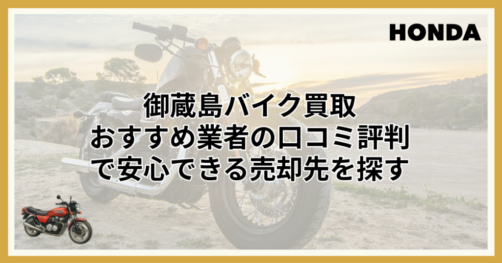 御蔵島でホンダのバイクを高く売るには、どこの買取業者に頼めばいいんだろう? 初めてのバイク売却で、何から始めればいいかわからない… 安く買い叩かれたり、後からトラブルになったりしないか心配… 信頼できる業者の見分け方がわからない… バイクを売却... -
