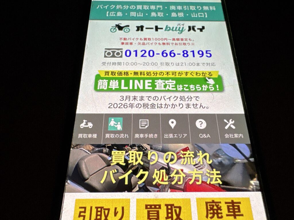 - 岡山県内のバイク処分専門店として20年以上の実績を誇り、顧客満足度の高いサービスを実現。3月末までの買取で2026年の税金が免除になります。